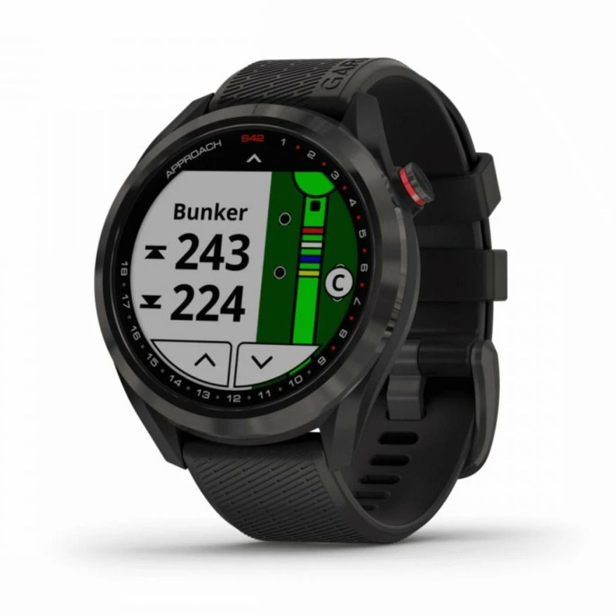 Have total confidence in your game with the stylish Garmin S42 GPS Golf Watch in carbon grey with a black band that looks stunning on and off the course.