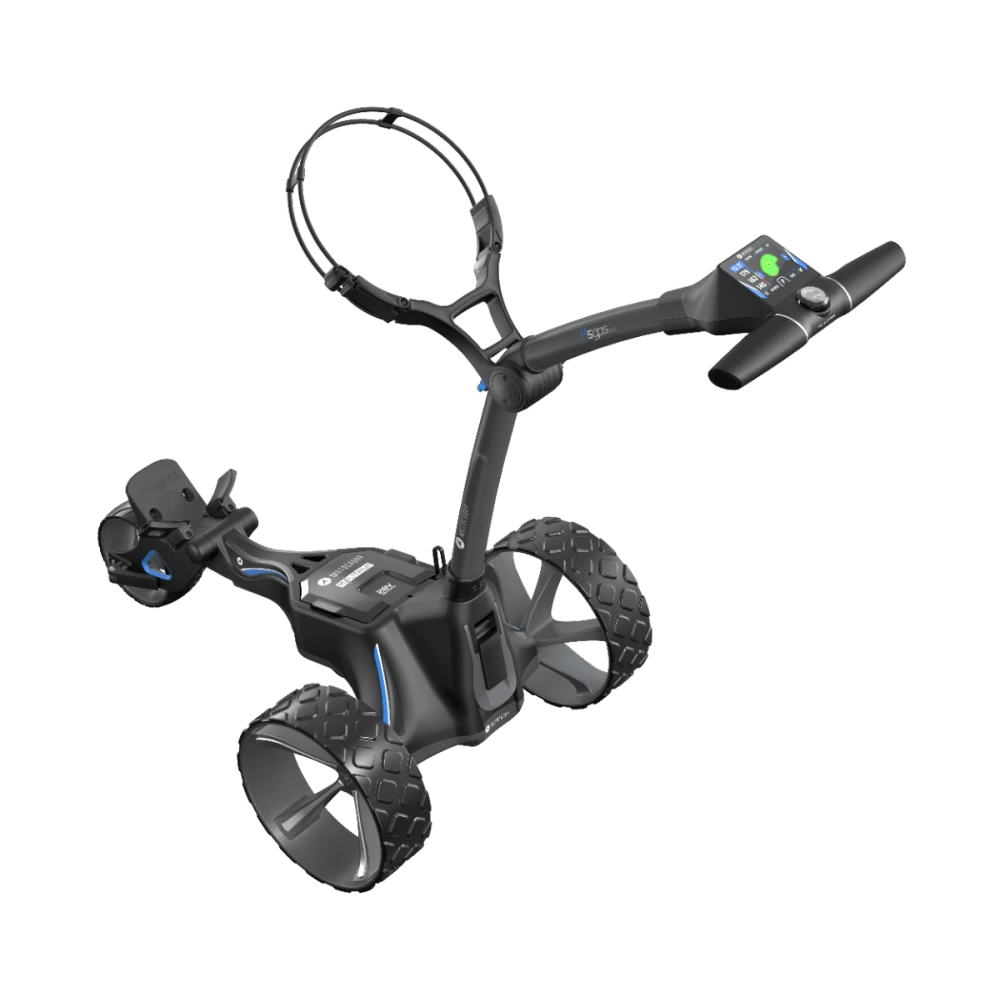 Motocaddy’s award-winning M5 GPS Electric Golf Trolley offers a fully‑integrated GPS built into a super-responsive 3.5” touchscreen display. Demonstrating high quality performance, this GPS comes with 40,000 pre-loaded courses with distances to the green, essential hazard information, and the ability to move the flag position: the M5 GPS is a premium option for GPS electric golf trolley technology. The M5 GPS also employs plenty of game-enhancement options such as a clock, round timer, and score tracking.